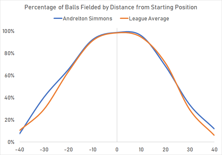 Interestingly, he tracks pretty closely with all shortstops, with the exception of a boost in the 30-foot bucket to his right. Like Ahmed, Simmons boasts a great arm to complement his range, elevating him further above other shortstops.