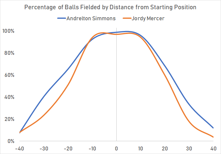 But instead of comparing him to all shortstops, what about comparing him to one with poor range? Here’s Simmons (blue line) versus Jordy Mercer (orange line).
