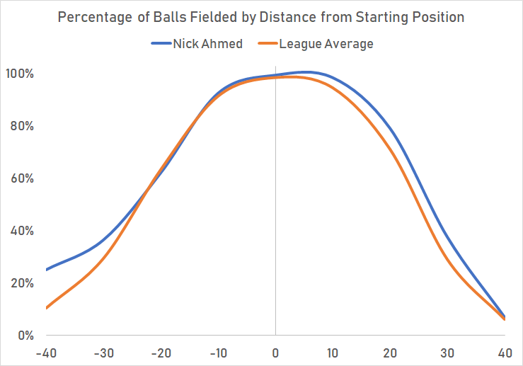 Ahmed (blue line) has been consistently above average to his left/up the middle (and can make highlight-reel plays like this one). He’s fielded a similar amount of balls as his peers going 10-20 feet to his right, but has reached more than the typical shortstop beyond that (like this one). And in addition to range, Ahmed’s arm helps separate him from other shortstops in converting outs.
