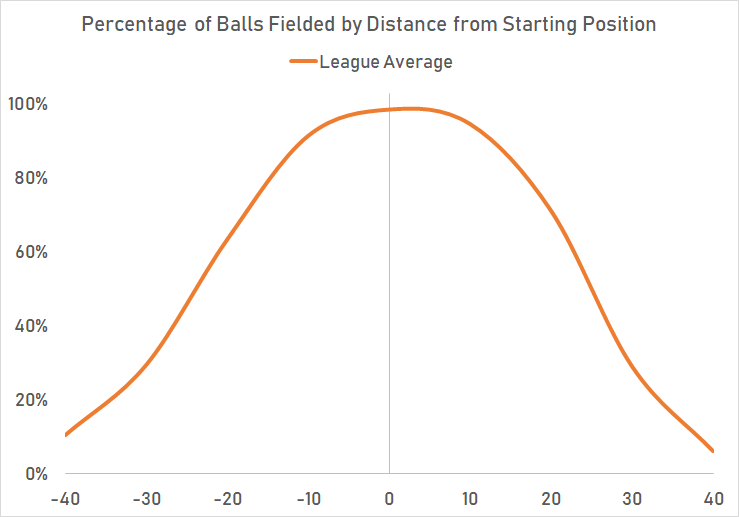These balls in play, when hit right at the shortstop, are fielded nearly 100% of the time. Balls hit about 10 feet in either direction are still above 90%. It dips to about 60-70% at 20 feet from the starting position, then down to about 30% at 30 feet away. And around 40 feet and beyond is where the rate of being fielded drops to 10% and below.