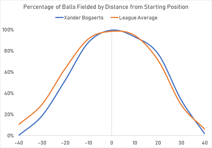 Bogaerts has been close to his peers on balls hit to his left, but well below average at reaching balls hit to his right.