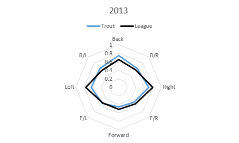 As a possible net result, Trout’s overall range in center field has been compromised. Above, you will see a GIF image comparison of Trout’s fielding success rates based on movement type from 2013-16. This is another important component of BIS Descriptive Defense, as it quantifies defensive strengths and weaknesses based on a fielder’s route to balls hit in play. Essentially, we are looking at a birds-eye view of Trout in center field and his conversion percentage based on how he moved to each ball; straight back, straight forward, to the left (again, from that bird’s eye view), to the right, and so on. To help contextualize everything, I have included a league-average number for center fielders and directly compared it to Trout in each season. This gives us a good reference point as to where Trout might be lagging behind in 2016.