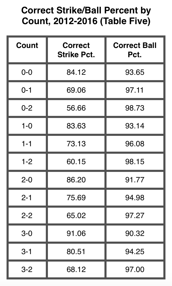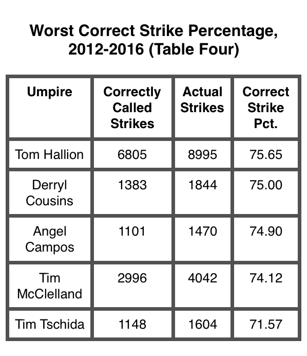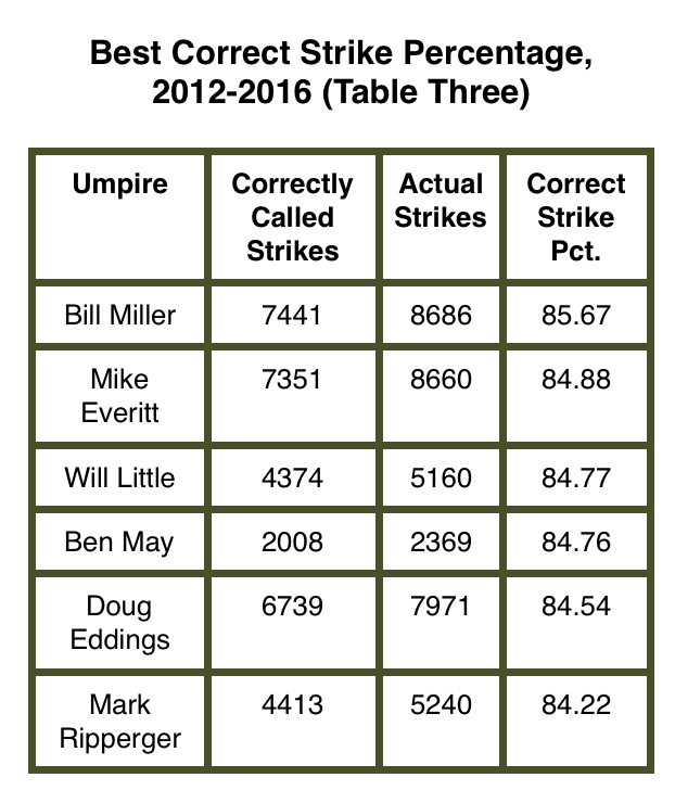 When gauging an umpires ability to correctly identify a Rule Book strike, an 85.67% success rate sets the mark with Bill Miller, while Tim Tschida ranks at the bottom of this list, only calling 71.57% correctly. We can infer from Tables Three and Four along with Table One, that while umpires are calling strikes within the strike zone more often, they are still missing over 17% of these pitches. It is important to note that this information does not take into account incorrectly identifying pitches outside the Rule Book strike zone as strikes, which when considering an umpire’s overall accuracy, should absolutely be taken into account.