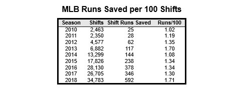 And more importantly, shift effectiveness exploded off the charts. Using the new technique developed by Baseball Info Solutions to evaluate shifts by comparing them to non-shift alignments, the number of runs saved per 100 shifts was at an all-time high in 2018 at 1.71 runs saved per 100 shifts: