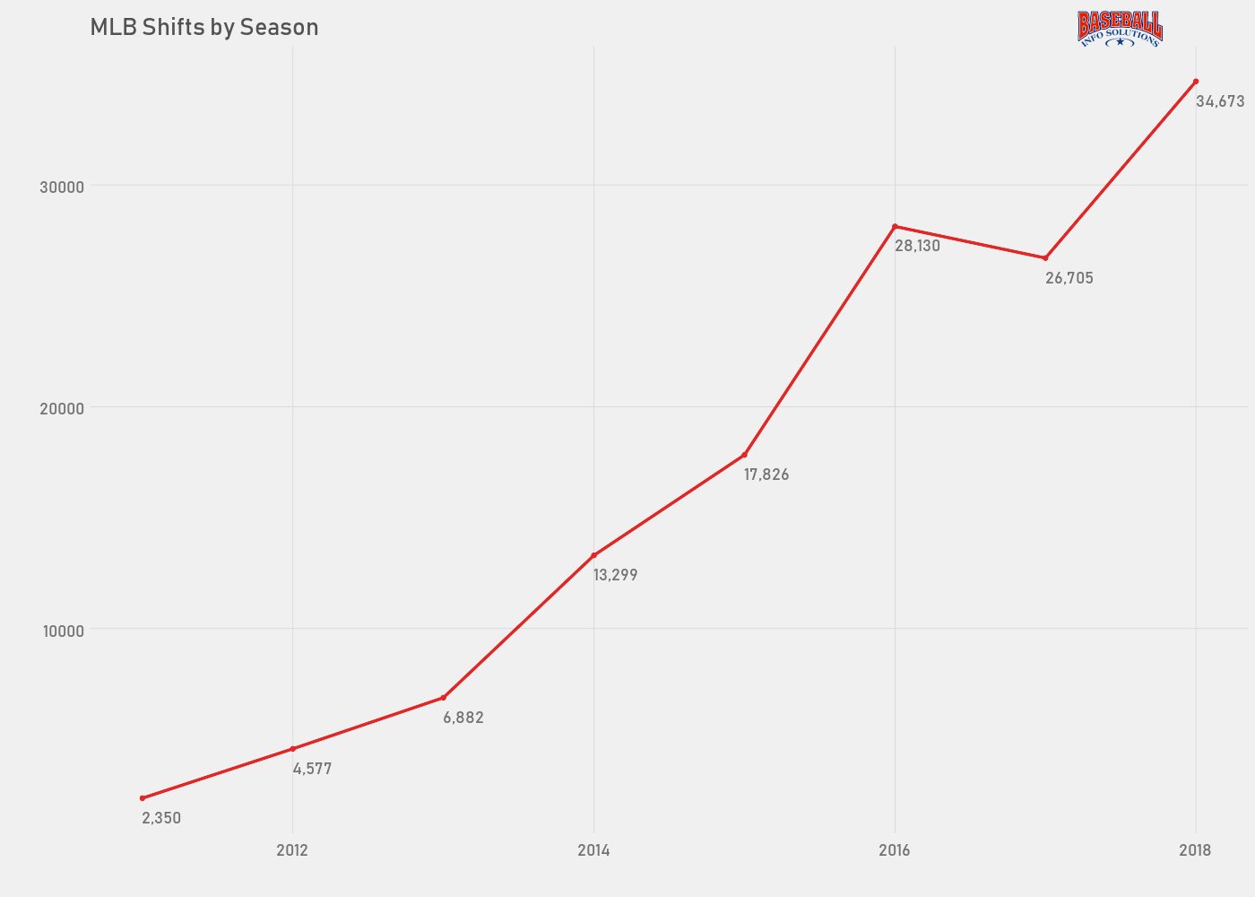 • The Royals, Phillies, Tigers, Mets, Cardinals doubled their shift usage from 2017 (the Cardinals still have a long way to go). Three of those five teams (Phillies, Tigers, Mets) had a new manager in 2018, while the Cardinals changed theirs mid-season.