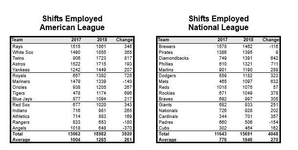 Last year we reported on these pages that the number of shifts employed by Major League Baseball teams declined for the first time after five straight years of increases between the low of a 34% increase in 2015 and 93% increase in 2014.