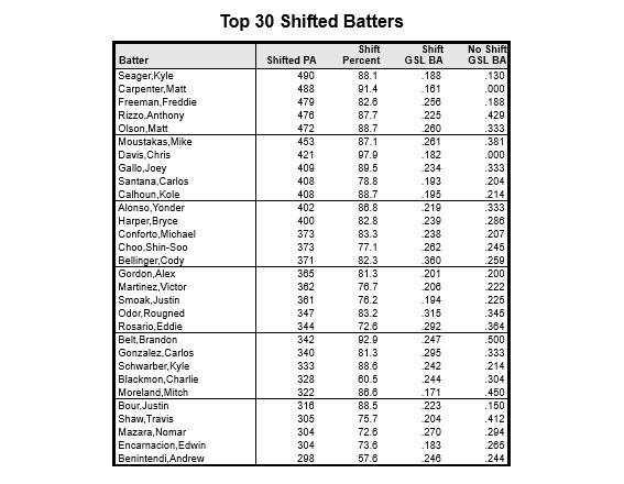 Finally, here is a team-by-team look at how often they are shifting, plus the list of the top 30 shifted batters and how they performed against the shift in 2018.