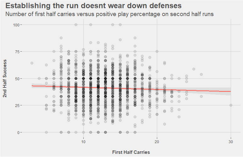 To look at this, we compared a team’s first half carries versus their positive play percentage (Positive%) on second half carries. (Positive% is an Expected Points-based metric that represents the percentage of plays a player earned a positive Expected Points Added value.) Establishing the run in the first half shows almost no correlation to second half success. In fact, it actually shows a small negative correlation, indicating at some level that rushing performance actually decreases the more carries are forced onto a running back early in the game.
