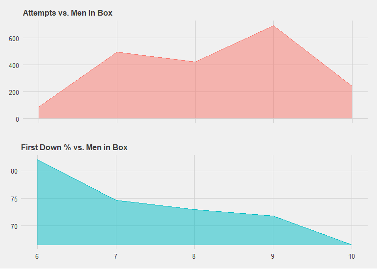 In terms of personnel, teams have also shown a strong tendency towards heavy personnel when it comes to short yardage. To see the effects this has had, we looked at first down conversion rates against the number of players the offense has “in the box”. Men in the box on the offensive side is just a count of how many men are on or near the line of scrimmage, excluding the quarterback.