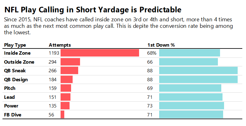 On third or fourth down with a yard or less to go since 2015, teams have called an inside zone (a run up the middle with no pulling lineman or lead blockers) 1,193 times. It’s outside counterpart is a distant second with only 294 attempts. QB sneak ranks third with 266.