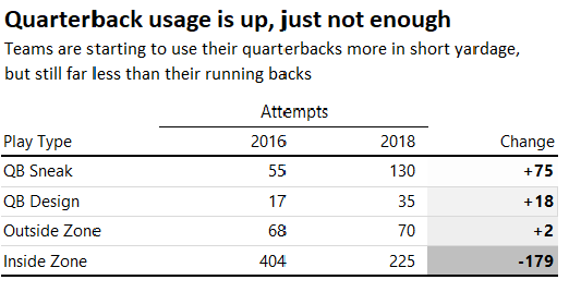In the defense of teams, the QB sneak has seen a steady increase since 2016, while the inside zone has rightfully seen a sharp decrease. Even still, the inside zone remained the most common play call in short yardage in 2018, outpacing the QB sneak by almost 100 attempts.
