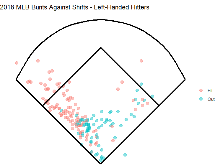 Here’s a look at a spray chart of all the bunts against shifts from left-handed hitters in 2018. The red points represent hits, and the blue points represent outs. There are a lot of hits down the third base line, especially if it can get past the pitcher.