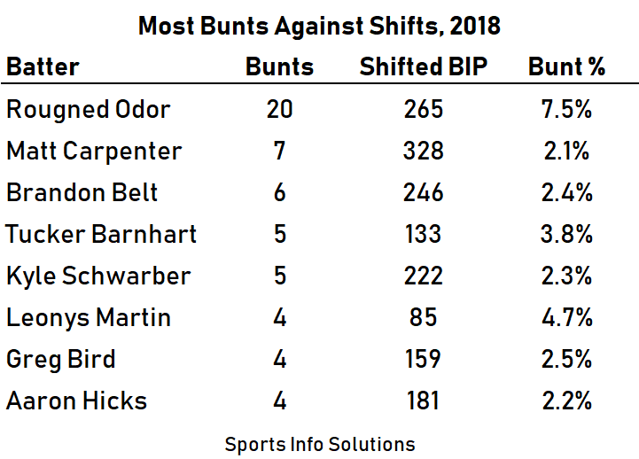 One batter, however, did it far more than most in 2018: Rougned Odor of the Texas Rangers. Odor’s 20 bunts against infield shifts were by far the most in MLB:
