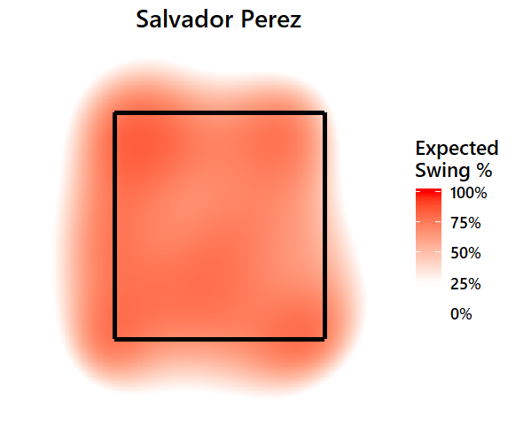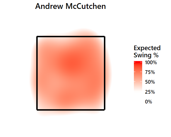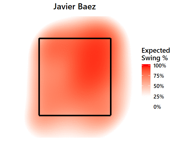 The plots below show how likely a batter is to swing if a pitch is thrown in a certain location, using data from the 2018 season. As the legends show, anything above a 25% expected swing rate is colored in red, with darker red indicating a higher swing rate. All plots are from the pitcher’s perspective.