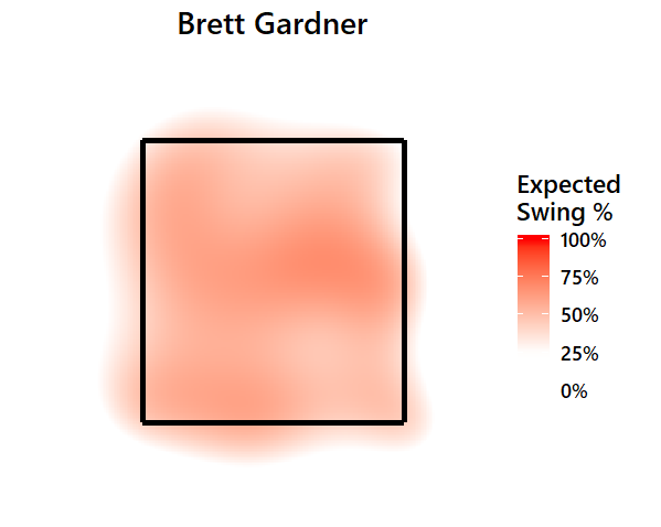 Gardner’s plot features a much lighter shade of red all around, indicating how much less likely he is to swing at pitches in the zone than Freeman. His Z-Swing% has consistently hovered in the 50-55% range for his career. There appears to be a slightly darker band of red across the middle of the zone, but Gardner is definitely willing to let pitches pass through everywhere.
