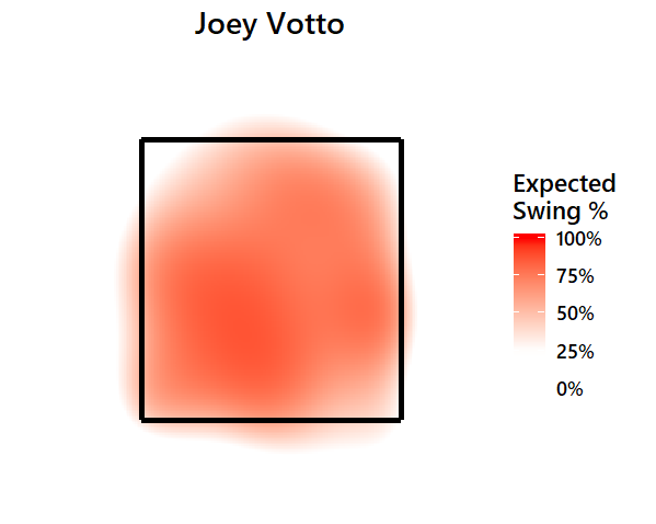 Votto’s plate discipline has long been elite, and his expected swing rate locations almost perfectly fit the strike zone borders. While he covered all in-zone pitches to some degree in 2018, it appears that there’s a bit higher expected swing rate on down-and-in pitches (like this pitch he got from Edgar Santana).