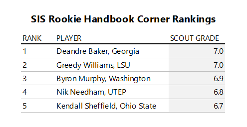 In the SIS Rookie Handbook, Greedy Williams was one of nine players to receive a grade of 7.0 or better, and was tied with DeAndre Baker as the highest rated corner grade. Initial mock drafts had Williams as a potential top 5 pick, and a virtual lock for top 10. Since then though, Williams has seen his stock taking a bit of a tumble. Mel Kiper has Williams 22nd on his big board, and his 3rd corner overall, trailing both Deandre Baker and Byron Murphy. Most mock drafts now have Williams as a mid to late first round pick, with some putting him as low as the top of the second round.