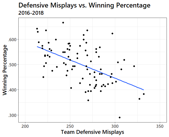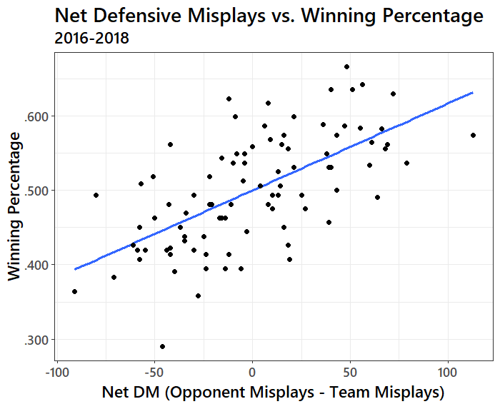 The above plot shows a team’s Defensive Misplays correlated with its winning percentage for seasons between 2016 and 2018. Not a super strong correlation (R-squared = 0.28), but clearly a trend where, on average, teams with fewer misplays tend to win more games and teams with more misplays tend to win fewer games.