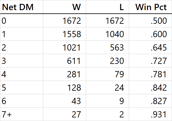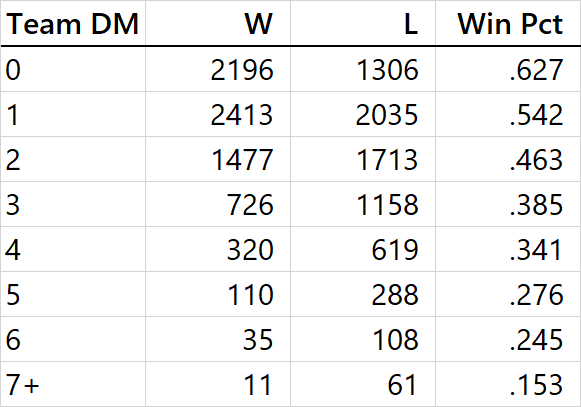 But what about in individual games? Here’s how teams fared over the last three seasons when making different amounts of Defensive Misplays in a game: