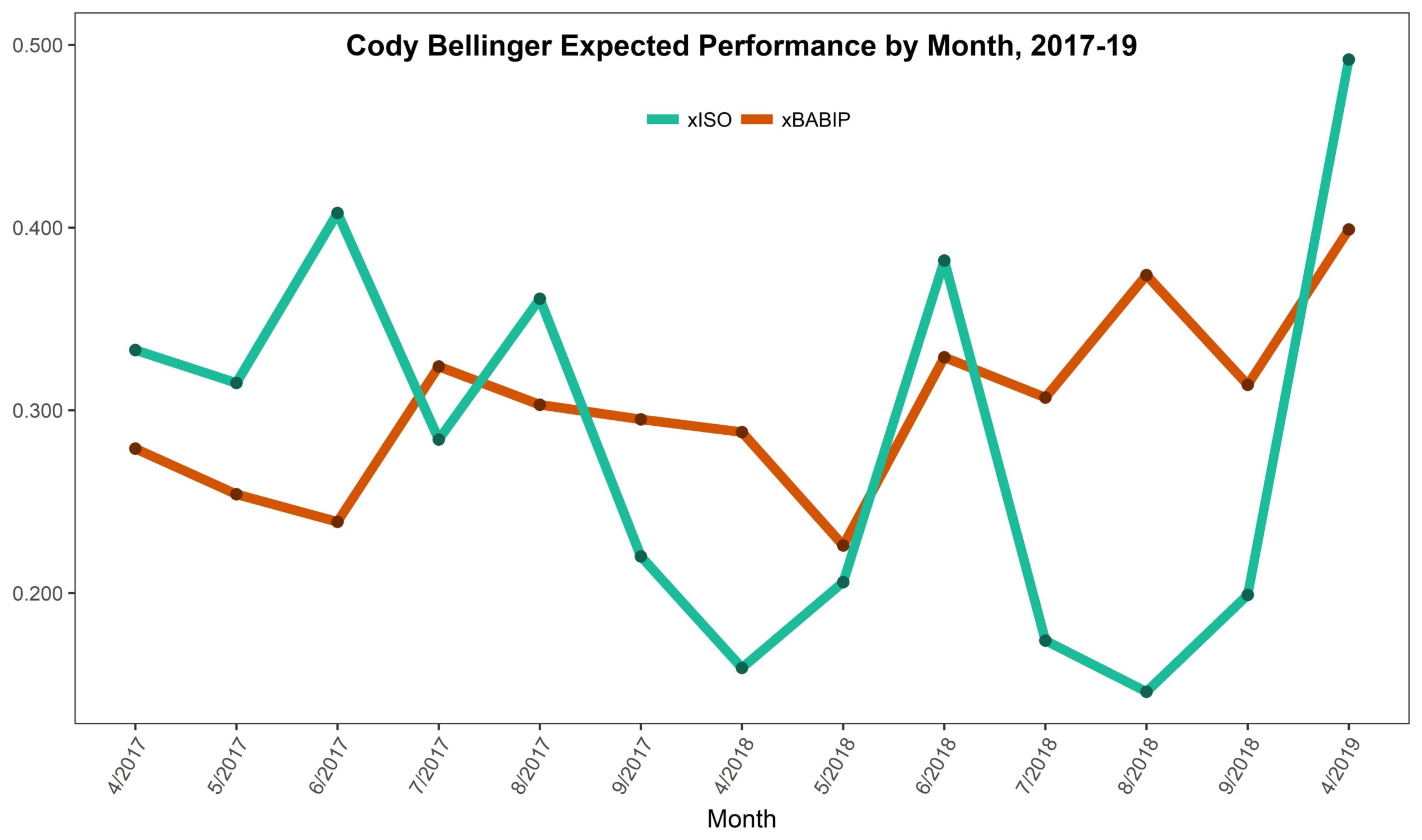 In this plot, we’ll show Bellinger’s expected Batting Average on Balls in Play (BABIP) and expected Isolated Power (ISO, or slugging percentage minus batting average). These two metrics focus only on balls in play, helping to show his overall hitting ability as well as his power specifically.