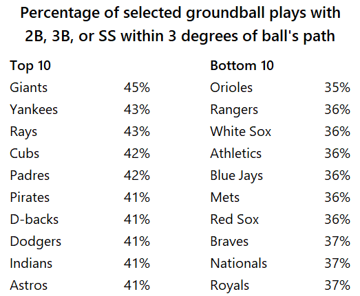Within three degrees of the ball’s path is where the expected out rate climbs north of 85%. So, based on all of the criteria above, which teams have played the highest percentage of groundballs with an infielder within three degrees of the path of the ball?