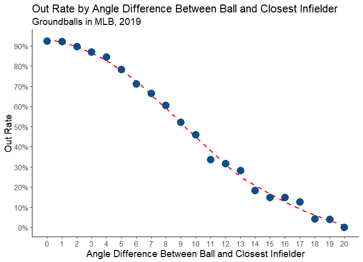 On a league-wide level, this plot shows the rate of getting an out on a play by how far the closest infielder was from the ball (laterally), in terms of angle difference.