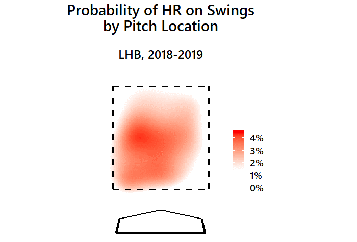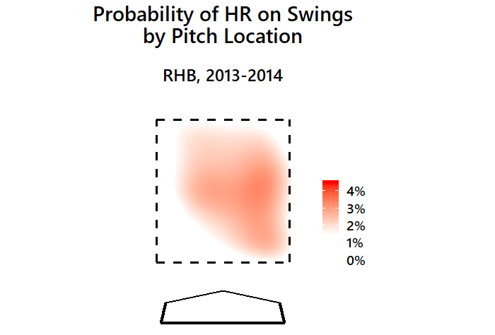 The following heat maps show the probability of a swing resulting in a home run, given a pitch’s location. It excludes bunts, as well as pitchers hitting.