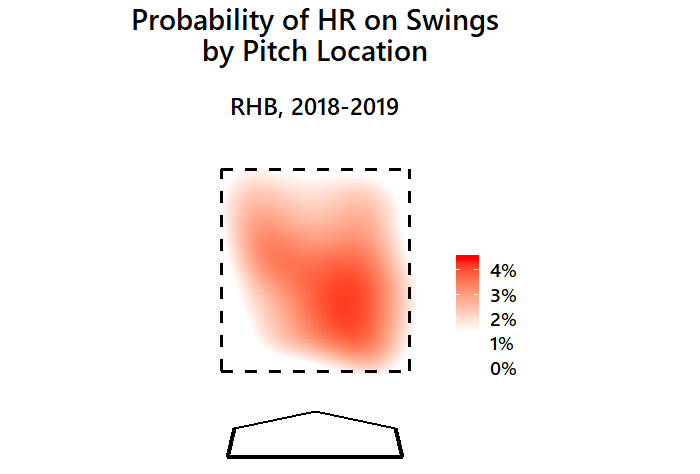 Pitches right down the middle/over the inner-third generate the most homers per swing. Pitches low in the zone tend to generate more HR compared to high or outside.