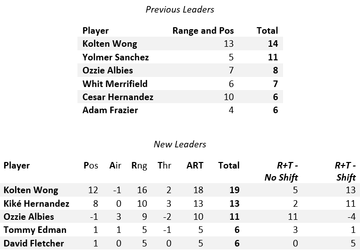Falling off the leaderboard was Yolmer Sanchez. His 17 Positioning Runs Saved buoyed his total in the previous system, but the new system rates him as slightly below average in 2019.