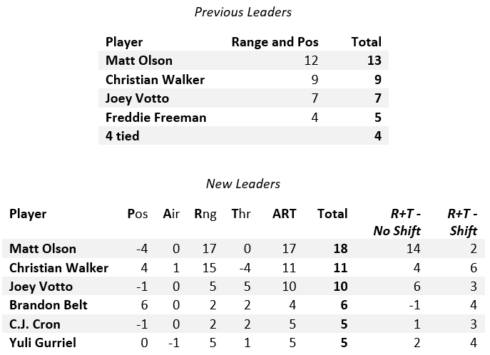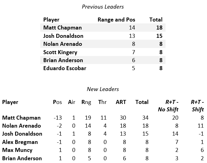 We don’t get a very different picture of the top players at first base as a result of these changes, but we do get a little bit of a picture of different players’ usage and competencies. Matt Olson and Christian Walker separate from each other partially because of the quality of their positioning, with Olson getting some negative positioning removed and Walker losing the benefit of strong positioning (more on the DBacks’ positioning in a bit).