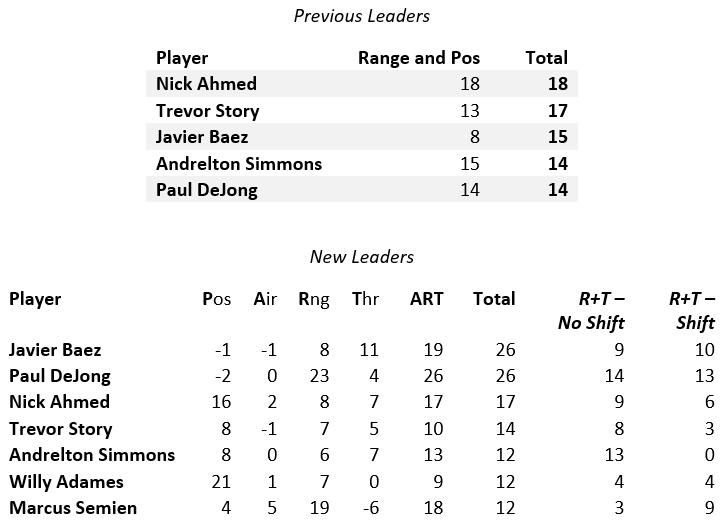 Ahmed benefited from Arizona’s outstanding positioning, saving an additional 16 runs. That great positioning gave him quite the boost relative to his peers in the previous DRS system, so he drops back a bit in the overall rankings. He also didn’t perform as well while shifted, so adding those plays back in didn’t help him like it did Baez and shortstop leader Paul DeJong.