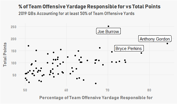 Statistically speaking, Perkins was one of the top quarterbacks in the country last season, ranking tenth in the NCAA in Total Points, SIS’s individual player contribution metric. Perkins was more important to his offense than nearly every other player was to their own in 2019, accounting for 78% of UVA’s offensive yardage (trailing only Anthony Gordon’s 84%). Needless to say, there are big shoes to fill at quarterback in Charlottesville next season.