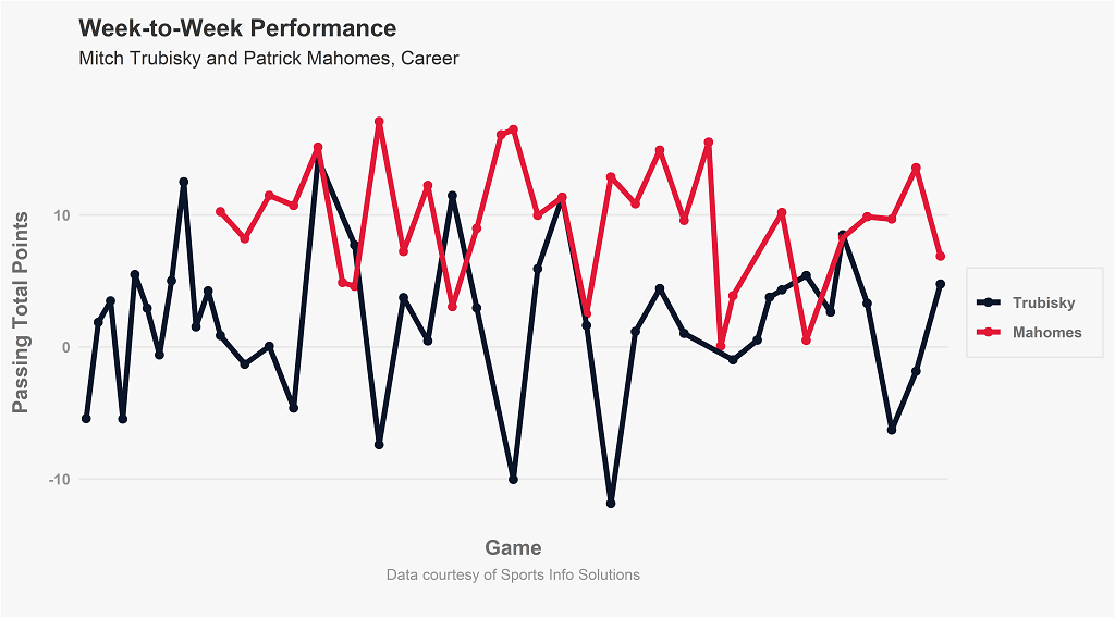 For this article, we’ll contrast Trubisky and Mahomes. There are several ways we can do this. We can do it by career accolades: