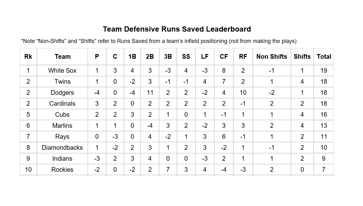 * Catchers Yasmani Grandal and James McCann have shored up an issue from 2019. They’ve combined for 3 Runs Saved after the team finished with -10 Runs Saved in 2019. By making McCann the backup, the White Sox were able to let Welington Castillo go and limit the playing time of Zack Collins. Those two players cost the White Sox 14 runs last season.