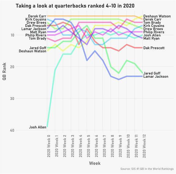 There’s a lot of quarterback parity (at least relative to the top of the list) once you get to No. 9 Philip Rivers. He’s neck-and-neck with No. 10 Matt Ryan, with Josh Allen a step behind at No. 11. We can talk about Justin Herbert, Ryan Tannehill, Kyler Murray and Teddy Bridgewater. They’re not quite there. They’re not good enough and not consistent enough yet. And if you’re asking about Ben Roethlisberger, last year’s absence cost him spots. He’s No. 18 (and we’ll add in Wednesday’s game against the Ravens next week).