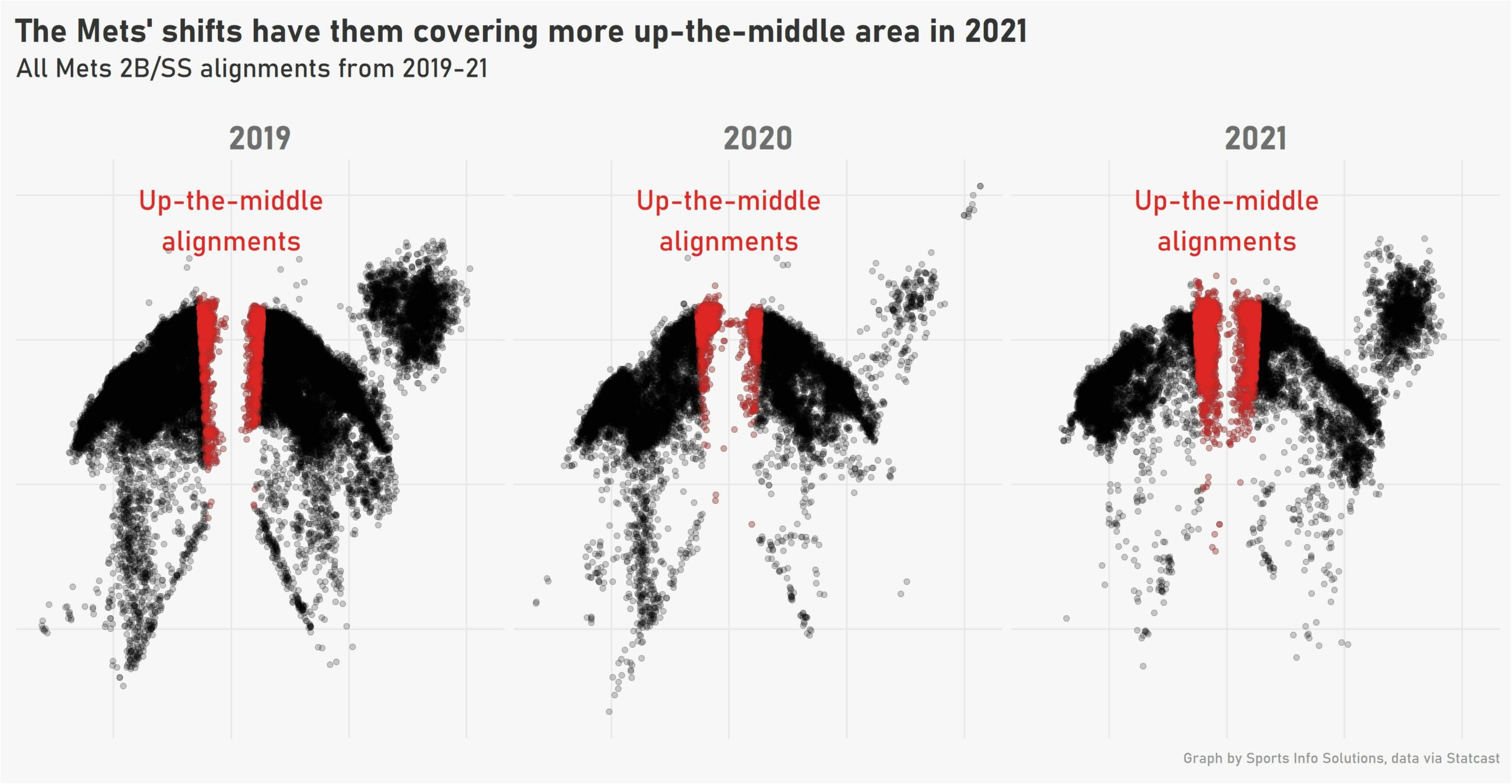 1) In 2021, two-thirds of the ground balls that have been hit up the middle against the Mets defense have come against defensive shifts (41 of 59). Two seasons ago, only 21% did (20 of 97)