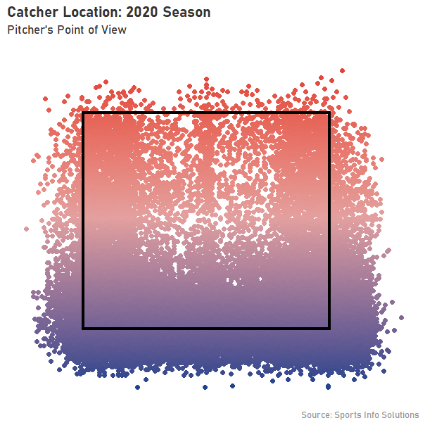 Sports Info Solutions collects the location of the catcher’s mitt for every pitch during the MLB season. For demonstration purposes, Figure 1 below shows the distribution of the location of the catcher’s mitt during the 2020 MLB season. Note: Colors are for stylistic purposes only.