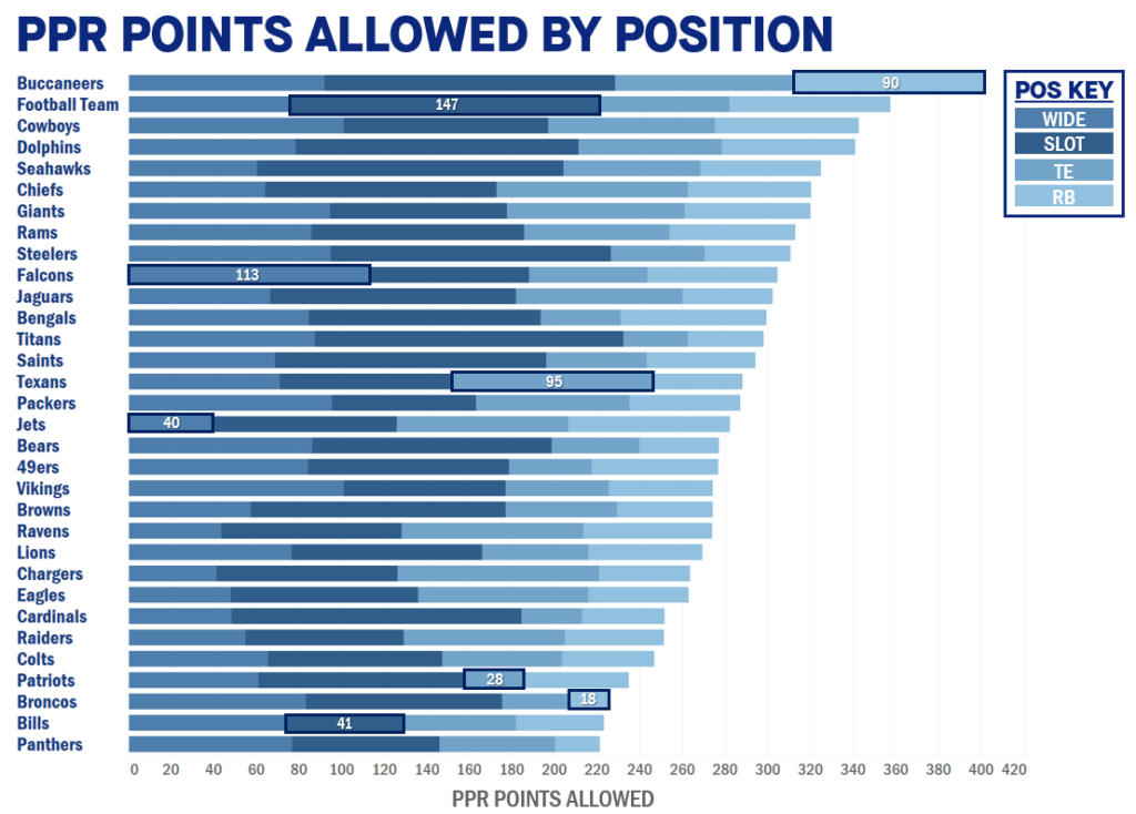 Highlighted are the teams that have allowed the most and fewest points by position group. For example, WFT has allowed the most points to Slot Receivers, while Buffalo has allowed the fewest.