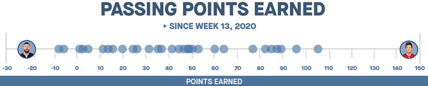 44-year-old Tom Brady has led the league by a wide margin with 146 Passing Points Earned, while the opposite is true for 39-year-old Ben Roethlisberger, who has distanced himself in last at minus-21.