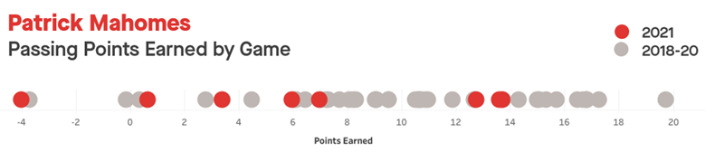 Mahomes has logged 52 career regular season games with 15+ pass attempts. His last four games have all ranked among the 10 worst in his career and none of his 2021 performances have cracked his top-10.