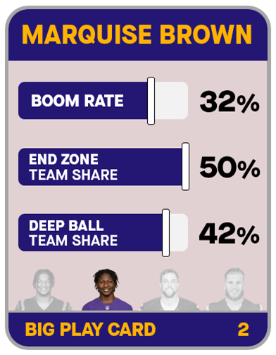 No receiver has had more total big play chances than Hollywood Brown. Brown ranks 1st in end zone team share and 7th in deep ball team share.