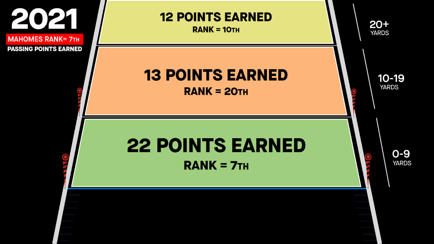 In his first three seasons, Mahomes ranked as the top overall QB in terms of Passing Points Earned and was excelling at all levels of the field.