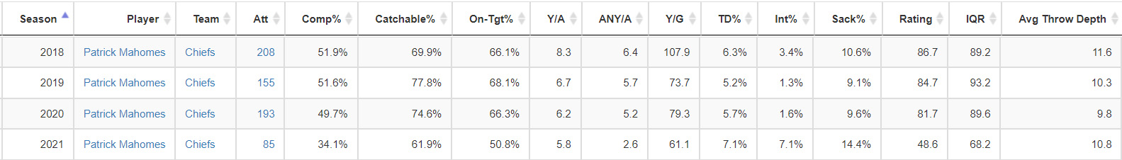 Focusing in on Mahomes’ performance by throw depth gives us more insight into where he’s struggling.