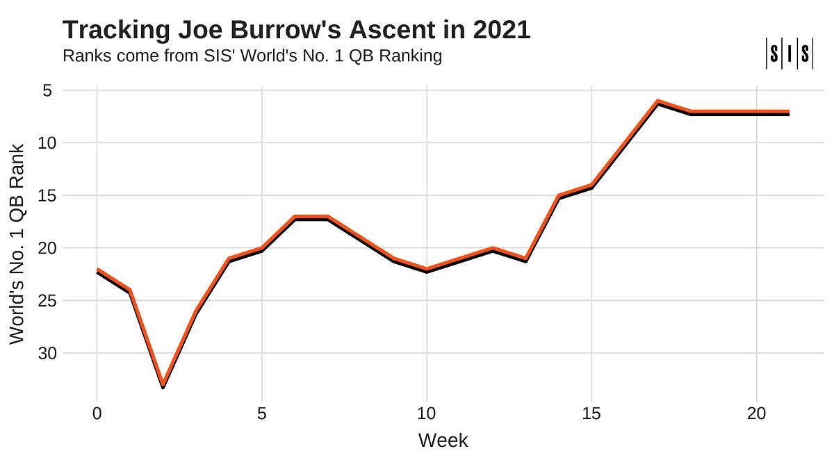 That last sentence is Burrow’s season story. He ranked as low as No. 33 as we noted. After a six-sack, two-pick game against the Chargers in Week 13, he ranked No. 21, two spots behind Jimmy Garoppolo and 15 places behind Kirk Cousins, of whom he now sits one spot ahead.