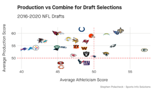 The Packers, Eagles, and Titans are the only teams to draft above-average athletes at this stage. These are teams that historically bank on players’ athletic traits. The Titans, Browns, and Rams are teams that look for production in college for their picks. The Panthers, Bills, Lions, 49ers, and Steelers evidently have little emphasis on combine results. The Giants, Bears, and Panthers evidently do not care for college production.