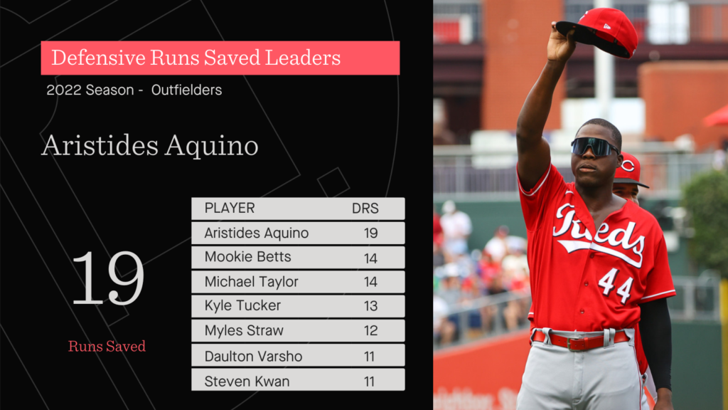 Aquino’s 8 Outfield Arm Runs Saved (a stat that considers both throw-outs and baserunners held) are the most in MLB this season.