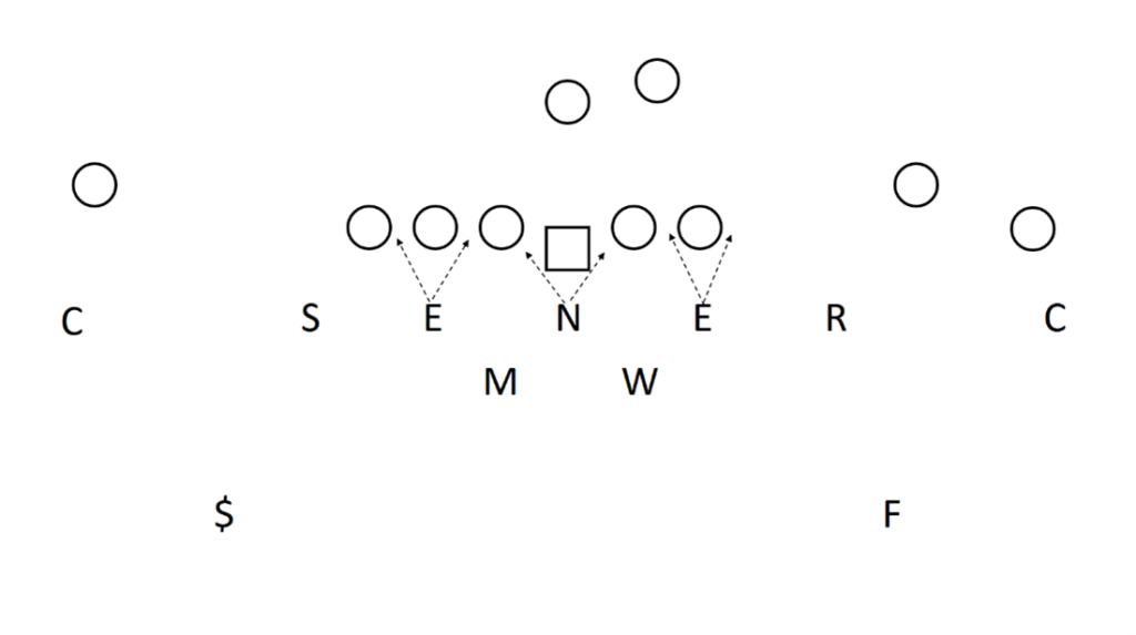 The 3-4 requires the defensive linemen to either cover two gaps each by controlling an offensive lineman or slant to a gap away from their alignment, both displayed below: