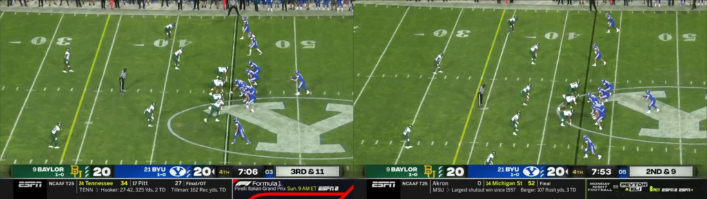 The hybrid nature of Baylor’s defense does not completely immunize it from all personnel and formation adjustments. Empty and unbalanced looks put the Bears in a bind throughout the game. BYU’s empty sets forced the Bears to apex a linebacker or end, resulting in 2.7 additional expected points for the Cougars.