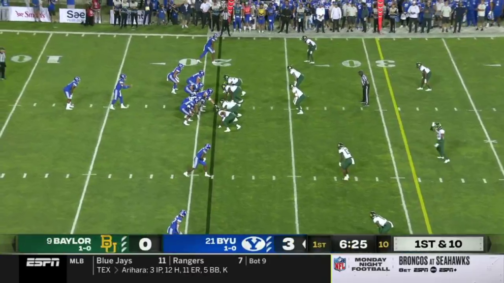 In Baylor’s 3-3-5, one linebacker functions as a standup defensive end, while the defensive line almost always plays with interior linemen in 3 and 2i techniques. The five defensive backs play in a two-high shell with the third safety shifted down near the line of scrimmage on the strong side of the formation.