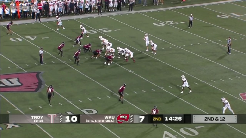 To get Troy out of its base defense, Western Kentucky used 10 and 00 personnel 65% of the game (55 snaps out of 85), up from its usual 40%. To cover the extra receivers, Troy either moved a linebacker or the standup end out wide to cover a receiver. This left them shorthanded against the run: